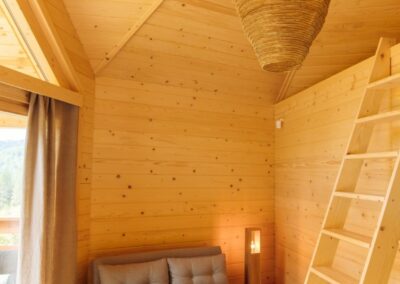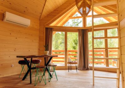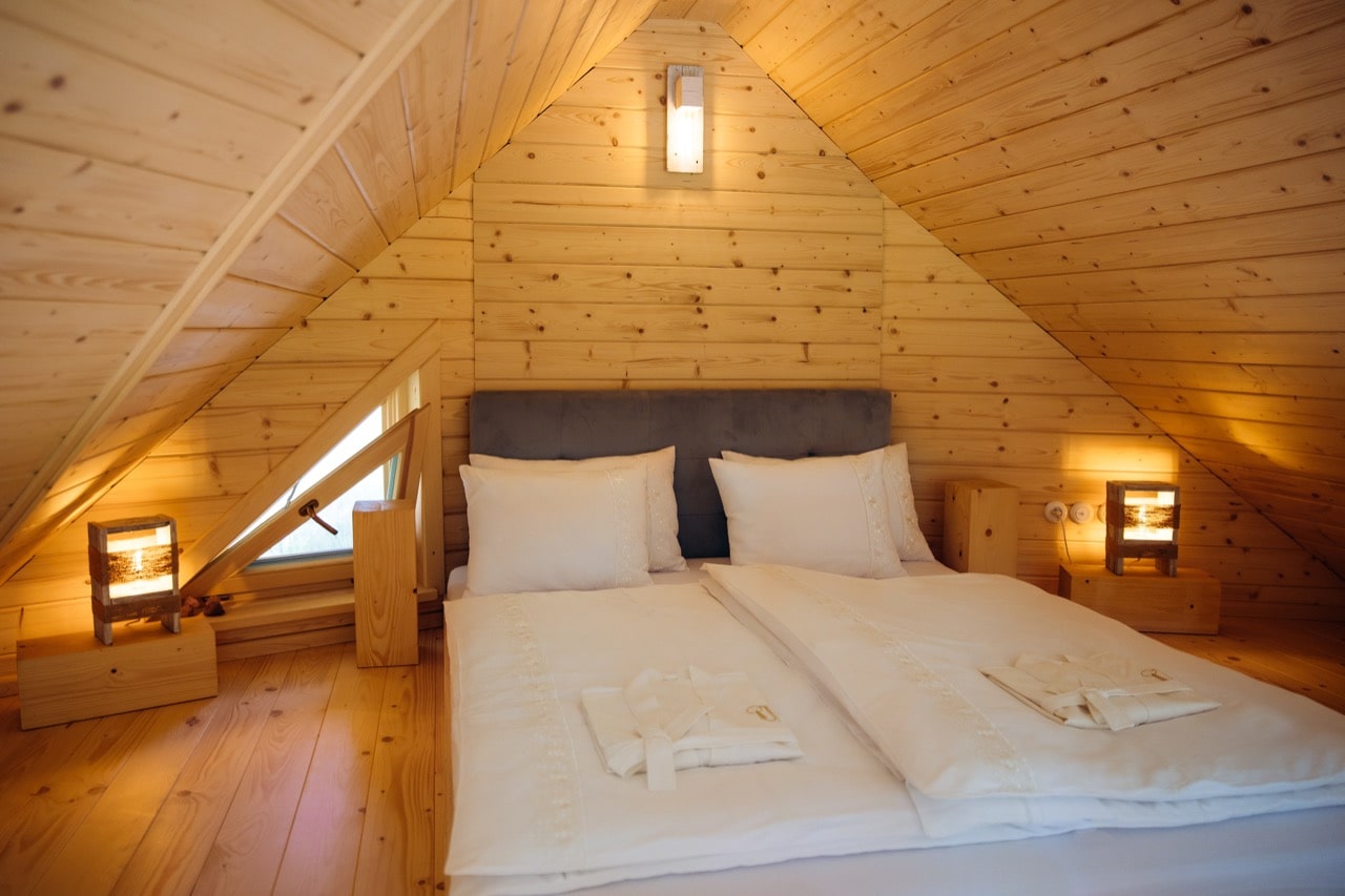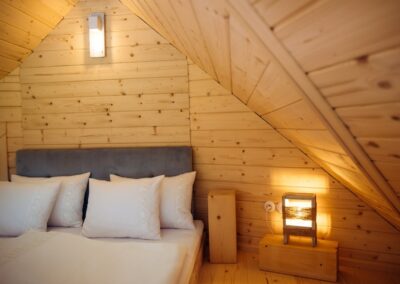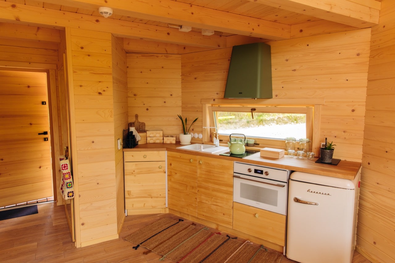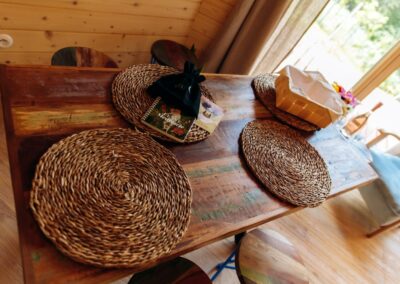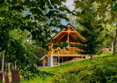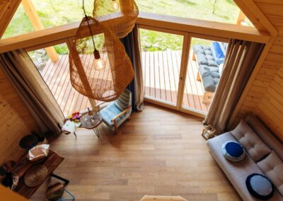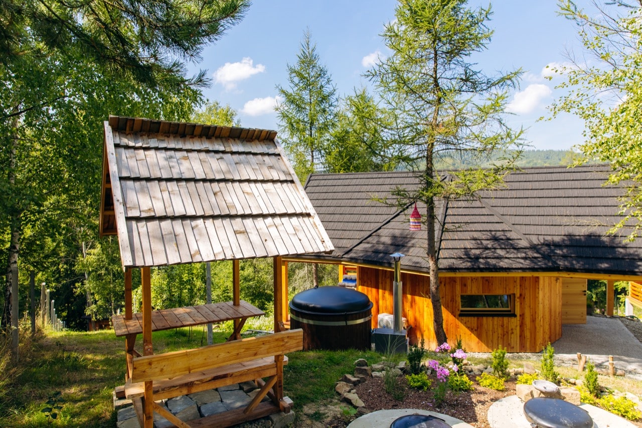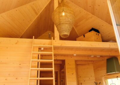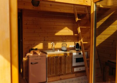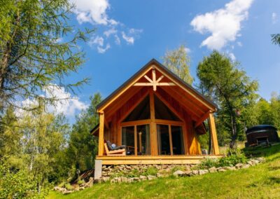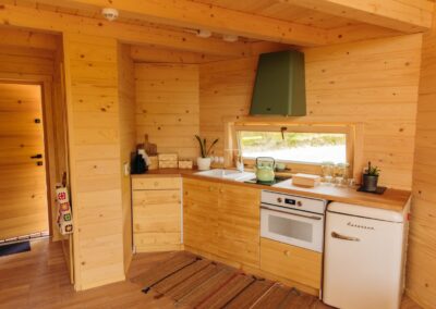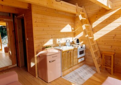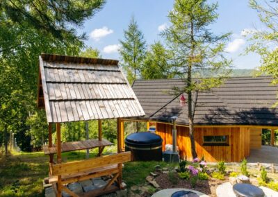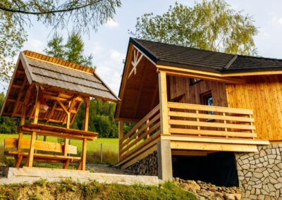 Dom o powierzchni zabudowy 35 m2 z otwartą antresolą. Przestronne, jasne i ciepłe wnętrze, materiały tylko naturalne (len i bawełna) w pełni wyposażony aneks kuchenny (kuchenka, piekarnik, lodówka, ekspres do kawy, garnki, naczynia itp.), obszerna łazienka, na dole rozkładana sofa, na antresoli wygodne małżeńskie łóżko, wieża hi-fi z dobrymi płytami, mała biblioteka z ciekawymi książkami i trochę nietuzinkowych, artystycznych dodatków. Z tarasu zejście do balii fińskiej oraz widok na osadę i pasmo Radziejowej. Dom wykończony w tonacji zielonej zgodnie z upodobaniami jelenia.