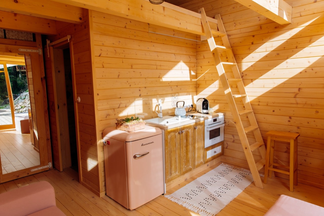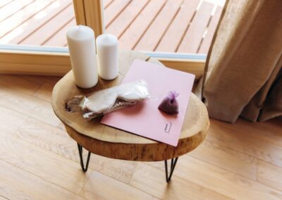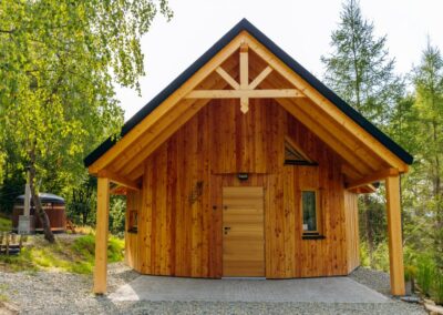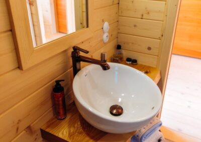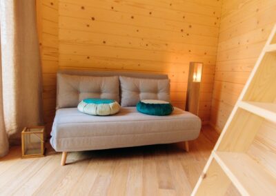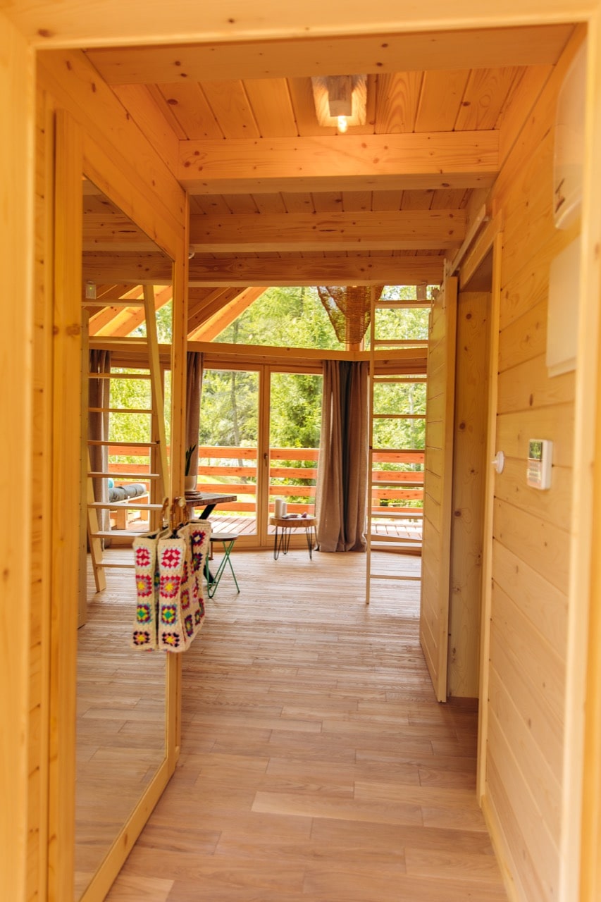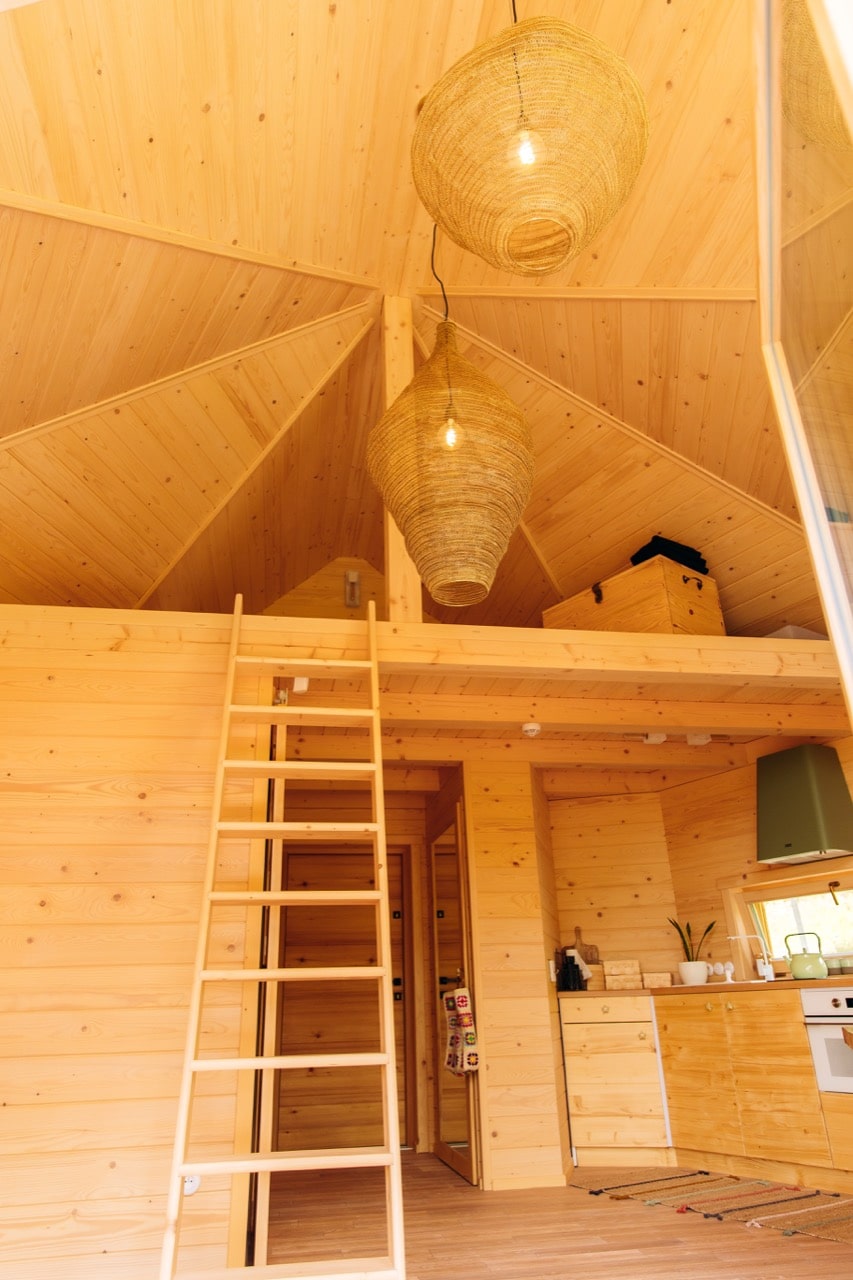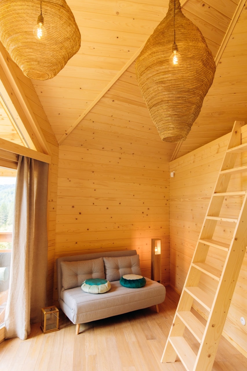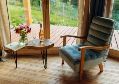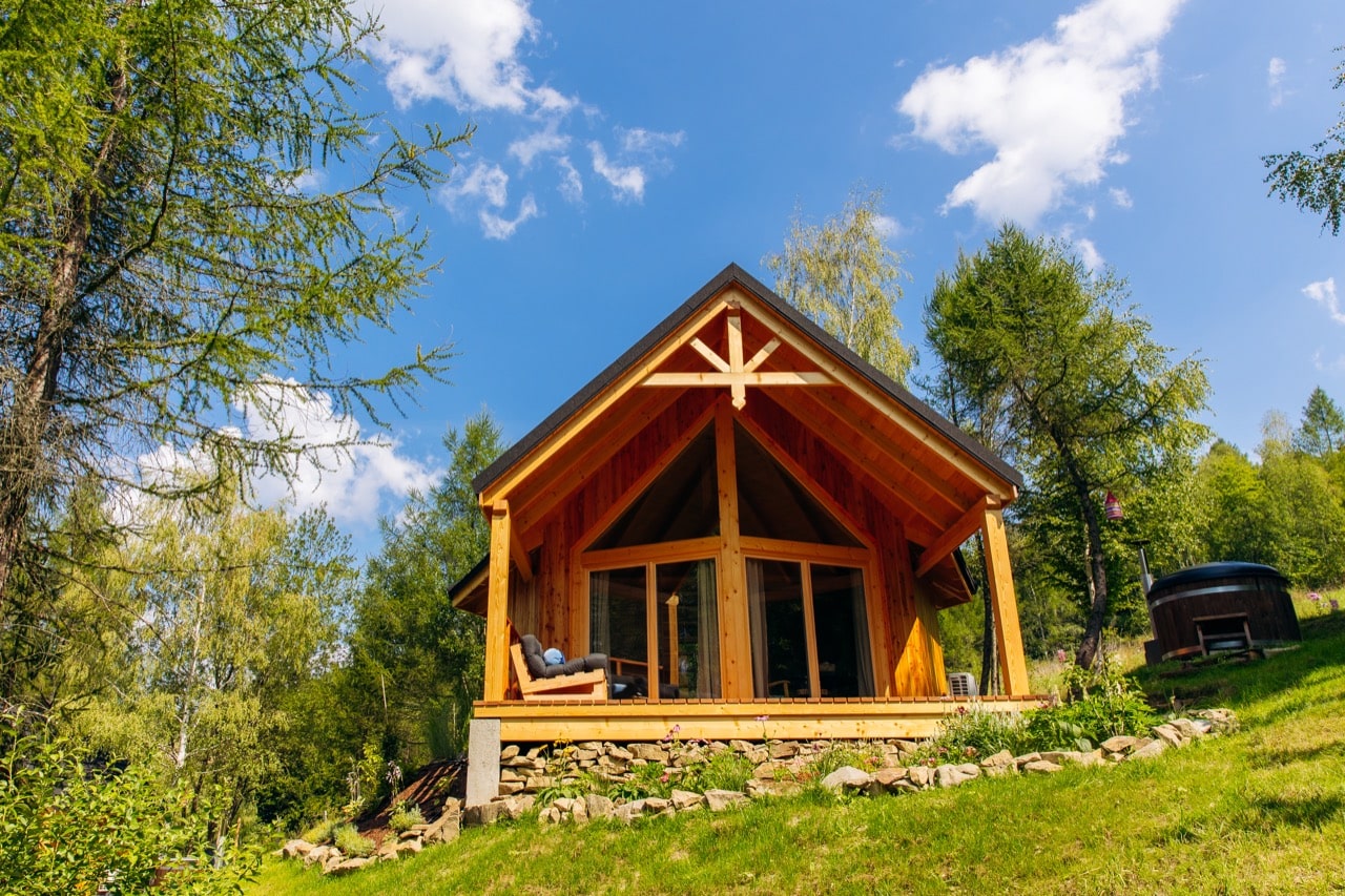 Dom o powierzchni zabudowy 35 m2 z otwartą antresolą. Przestronne, jasne i ciepłe wnętrze, materiały tylko naturalne (len i bawełna) w pełni wyposażony aneks kuchenny (kuchenka, piekarnik, lodówka, ekspres do kawy, garnki, naczynia itp.), obszerna łazienka, na dole rozkładana sofa, na antresoli wygodne małżeńskie łóżko, wieża hi-fi z dobrymi płytami, mała biblioteka z ciekawymi książkami i trochę nietuzinkowych, artystycznych dodatków. Z tarasu zejście do balii fińskiej oraz widok na osadę i pasmo Radziejowej. Dom wykończony w tonacji zielonej zgodnie z upodobaniami jelenia.
