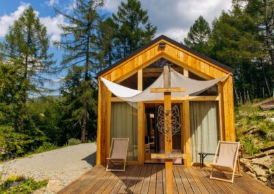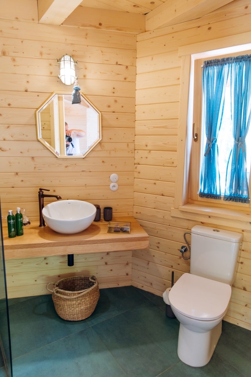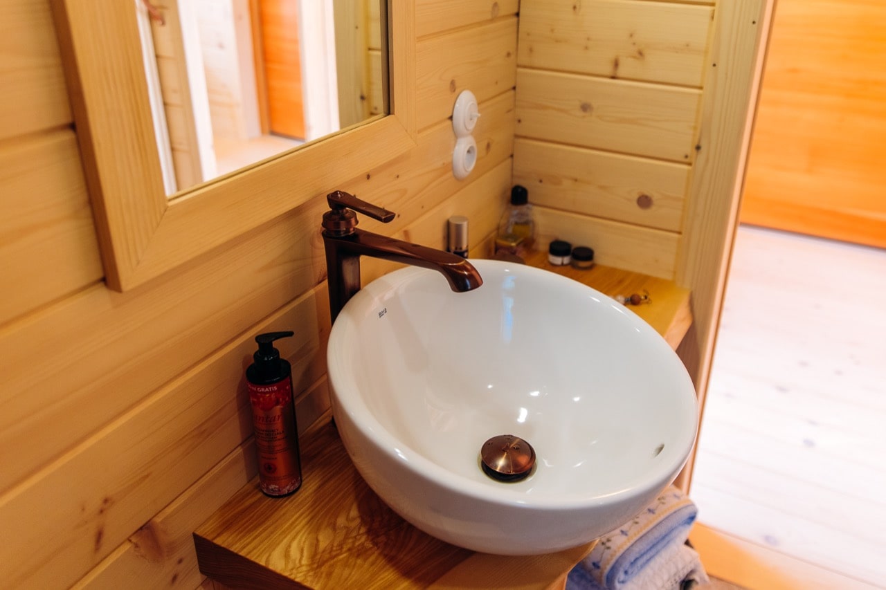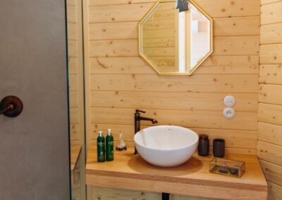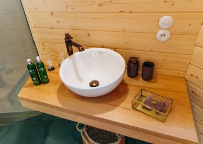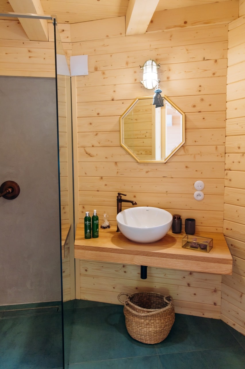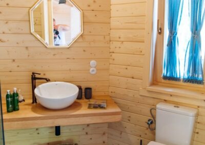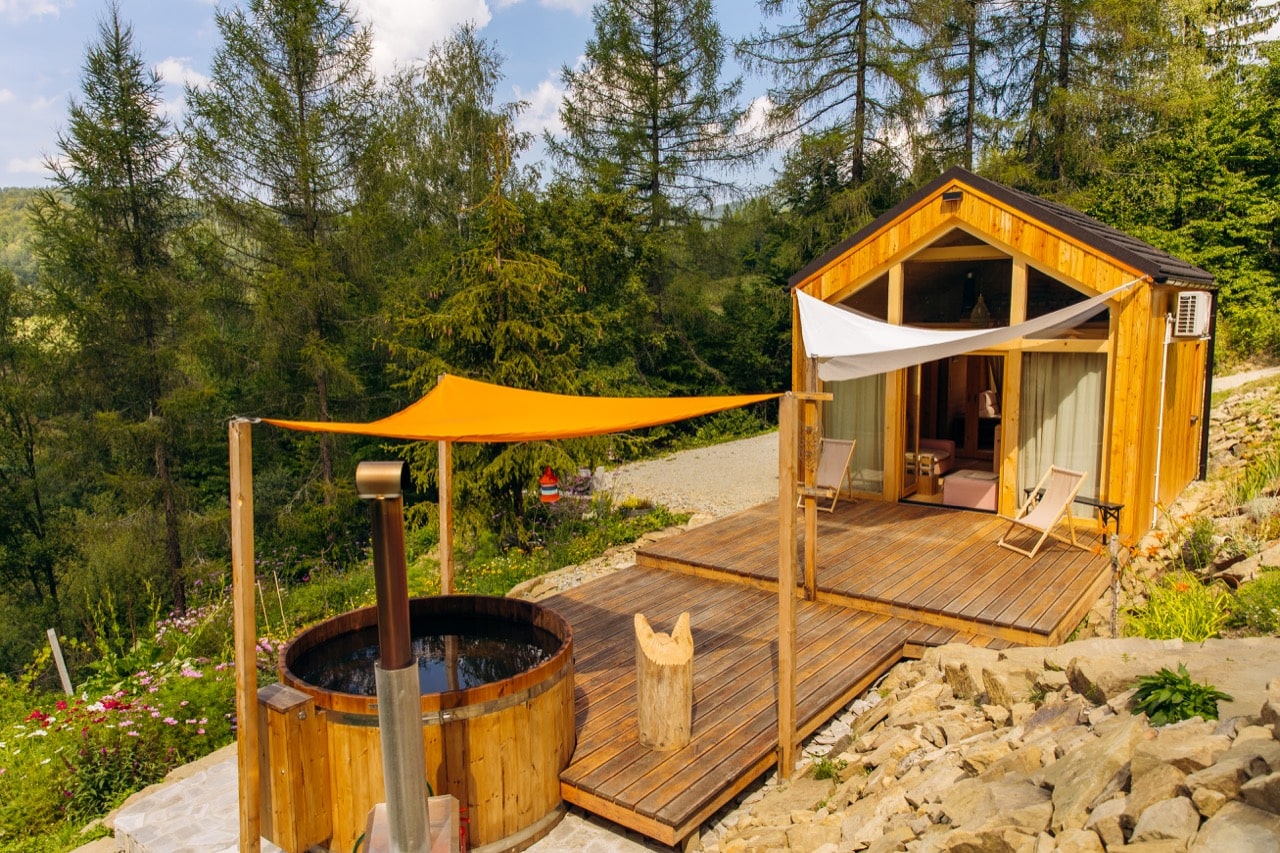 Dom o powierzchni zabudowy 35 m2 z otwartą antresolą. Przestronne, jasne i ciepłe wnętrze, materiały tylko naturalne (len i bawełna) w pełni wyposażony aneks kuchenny (kuchenka, piekarnik, lodówka, ekspres do kawy, garnki, naczynia itp.), obszerna łazienka, na dole rozkładana sofa, na antresoli wygodne małżeńskie łóżko, wieża hi-fi z dobrymi płytami, mała biblioteka z ciekawymi książkami i trochę nietuzinkowych, artystycznych dodatków. Z tarasu zejście do balii fińskiej oraz widok na osadę i pasmo Radziejowej. Dom wykończony w tonacji zielonej zgodnie z upodobaniami jelenia.