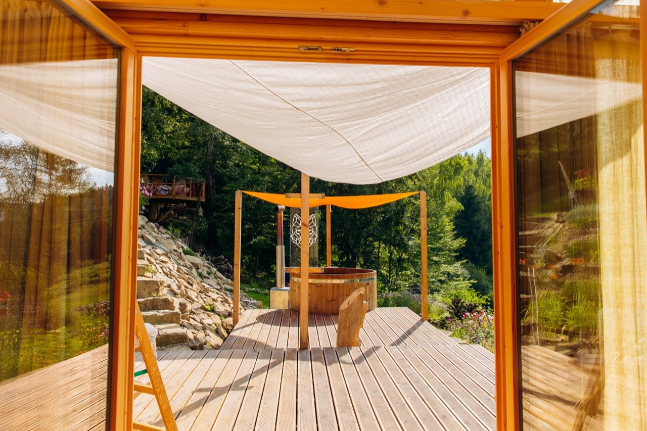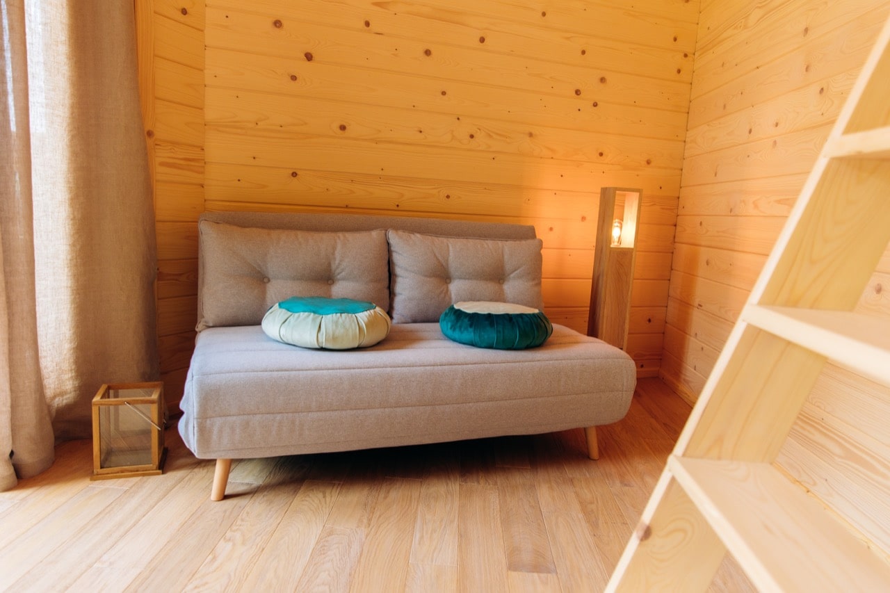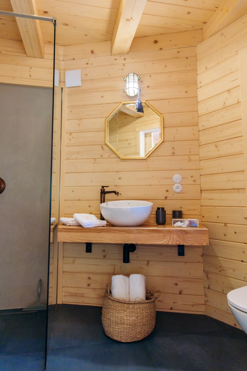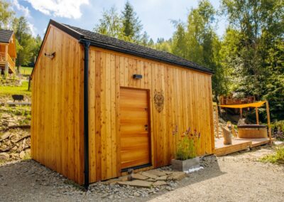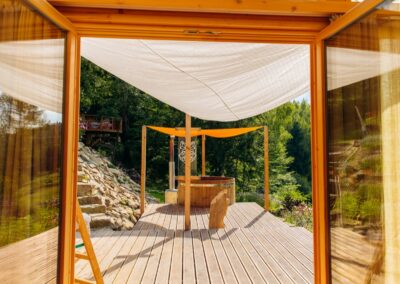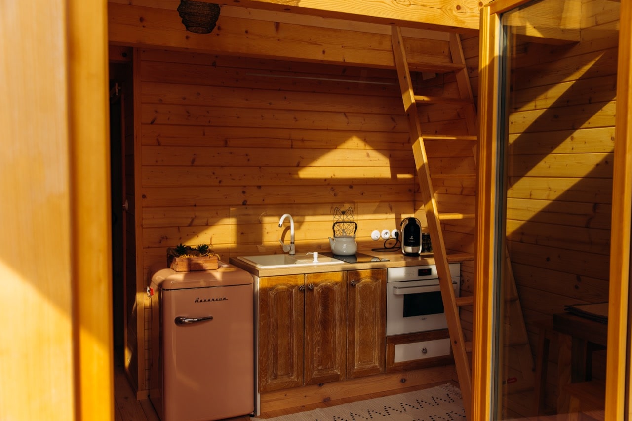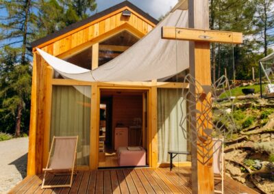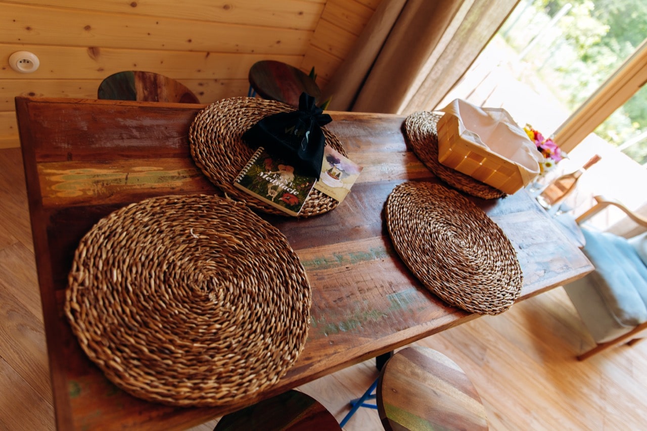 Dom o powierzchni zabudowy 35 m2 z otwartą antresolą. Przestronne, jasne i ciepłe wnętrze, materiały tylko naturalne (len i bawełna) w pełni wyposażony aneks kuchenny (kuchenka, piekarnik, lodówka, ekspres do kawy, garnki, naczynia itp.), obszerna łazienka, na dole rozkładana sofa, na antresoli wygodne małżeńskie łóżko, wieża hi-fi z dobrymi płytami, mała biblioteka z ciekawymi książkami i trochę nietuzinkowych, artystycznych dodatków. Z tarasu zejście do balii fińskiej oraz widok na osadę i pasmo Radziejowej. Dom wykończony w tonacji zielonej zgodnie z upodobaniami jelenia.