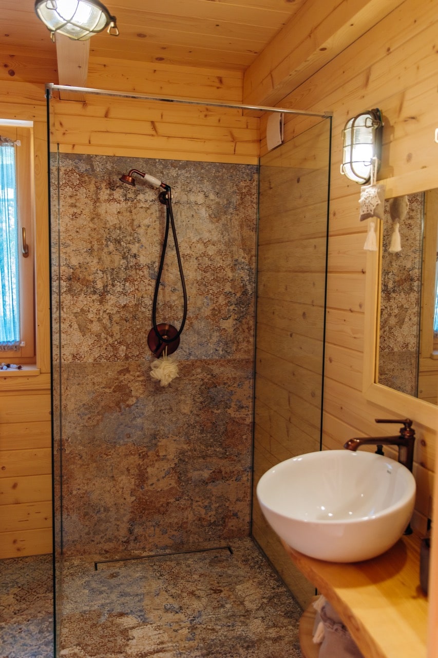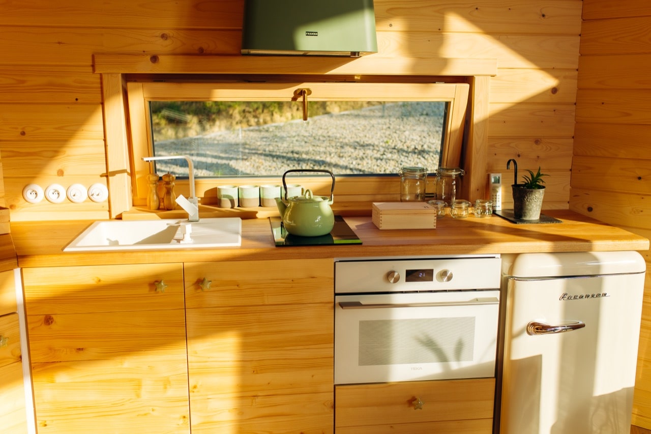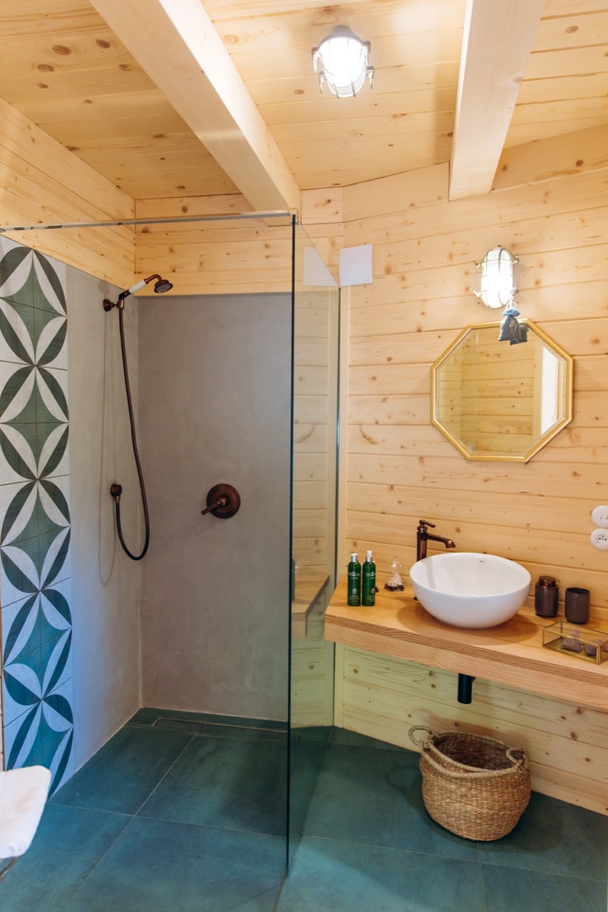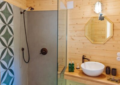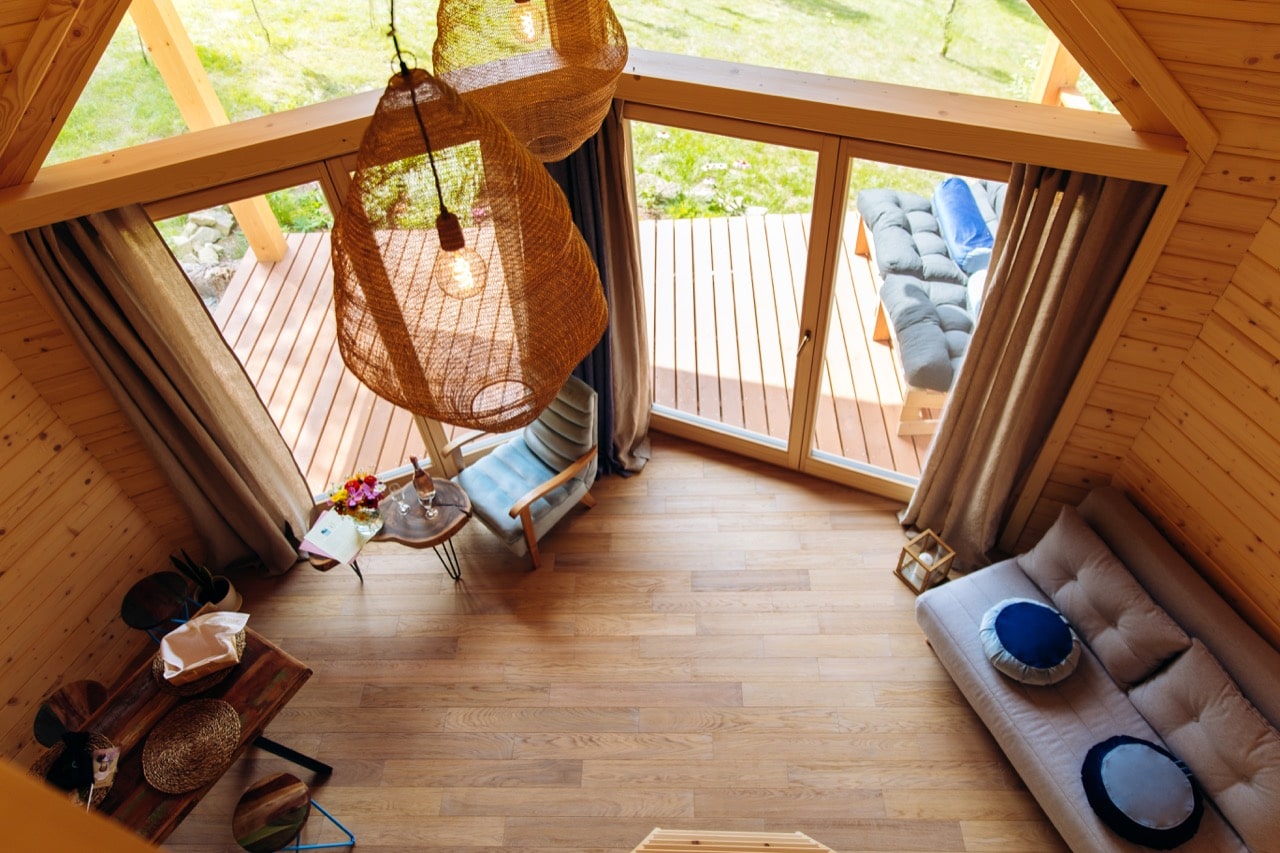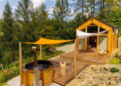 Dom o powierzchni zabudowy 35 m2 z otwartą antresolą. Przestronne, jasne i ciepłe wnętrze, materiały tylko naturalne (len i bawełna) w pełni wyposażony aneks kuchenny (kuchenka, piekarnik, lodówka, ekspres do kawy, garnki, naczynia itp.), obszerna łazienka, na dole rozkładana sofa, na antresoli wygodne małżeńskie łóżko, wieża hi-fi z dobrymi płytami, mała biblioteka z ciekawymi książkami i trochę nietuzinkowych, artystycznych dodatków. Z tarasu zejście do balii fińskiej oraz widok na osadę i pasmo Radziejowej. Dom wykończony w tonacji zielonej zgodnie z upodobaniami jelenia.