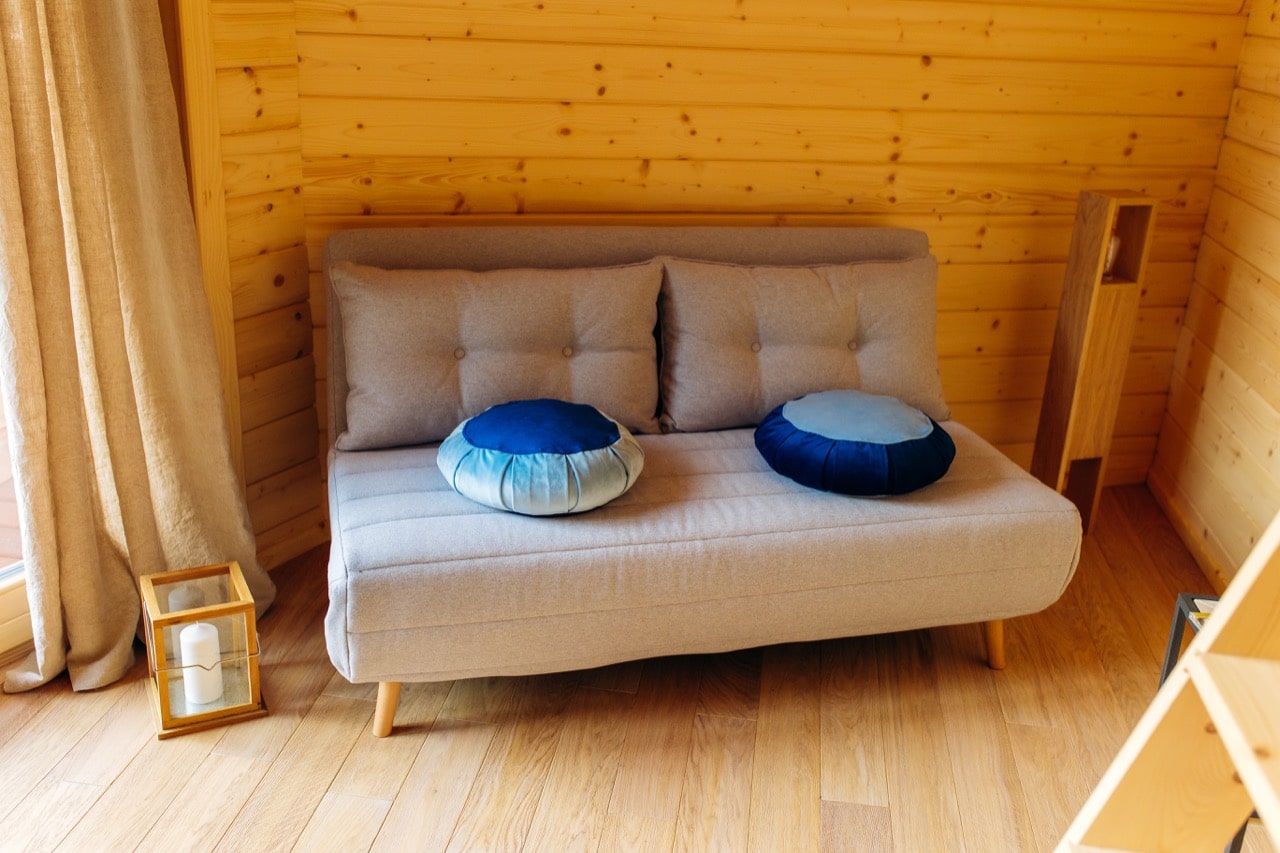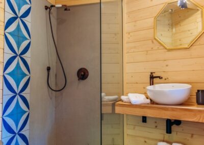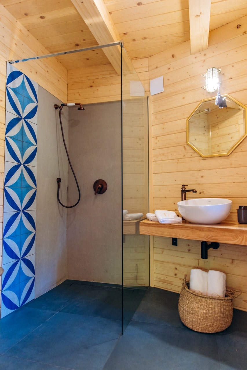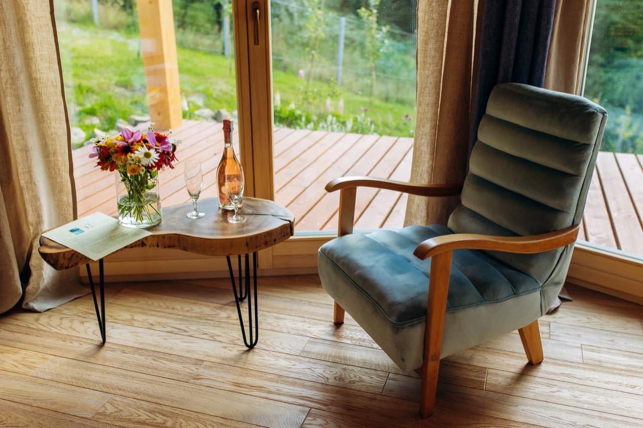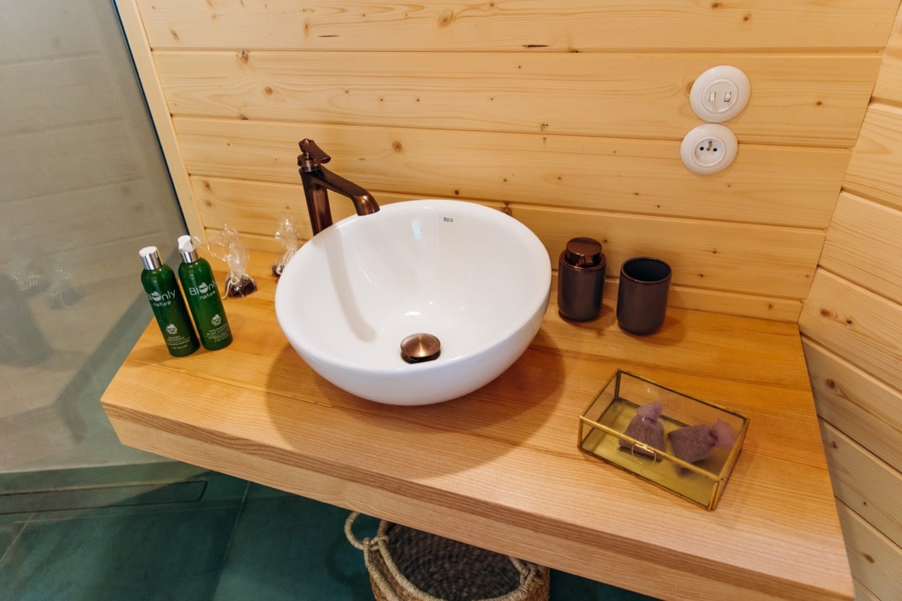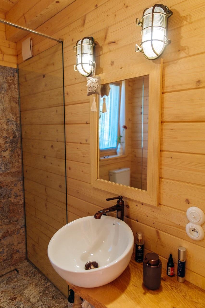 Dom o powierzchni zabudowy 35 m2 z otwartą antresolą. Przestronne, jasne i ciepłe wnętrze, materiały tylko naturalne (len i bawełna) w pełni wyposażony aneks kuchenny (kuchenka, piekarnik, lodówka, ekspres do kawy, garnki, naczynia itp.), obszerna łazienka, na dole rozkładana sofa, na antresoli wygodne małżeńskie łóżko, wieża hi-fi z dobrymi płytami, mała biblioteka z ciekawymi książkami i trochę nietuzinkowych, artystycznych dodatków. Z tarasu zejście do balii fińskiej oraz widok na osadę i pasmo Radziejowej. Dom wykończony w tonacji zielonej zgodnie z upodobaniami jelenia.