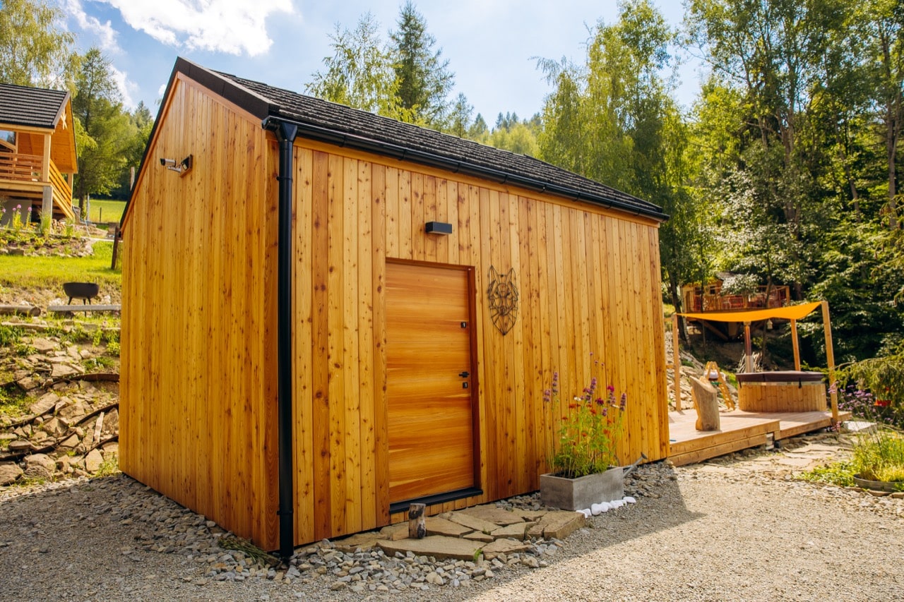 Dom o powierzchni i wyposażeniu identycznym jak Jeleń. Z tarasu wejście po kilku schodkach bezpośrednio do balii fińskiej oraz widok na sad i pobliski las. Wnętrze w tonacji niebieskiej – powód prosty – sowa jest bliżej błękitu nieba niż jeleń. Sowa jest otoczona z trzech stron pięknymi rabatami kwiatowymi. Każdy dom posiada własny bezkolizyjny wjazd i parking.